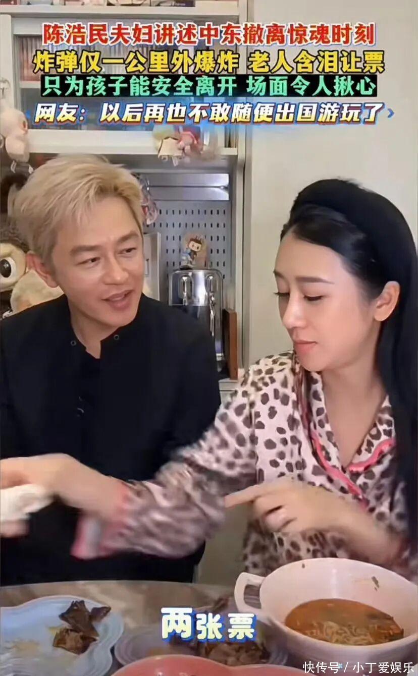 2026年3月初,陈浩民夫妇携岳父母滞留迪拜期间突遇当地冲突升级,导弹爆炸点距其住所仅1.2公里,生死关头仅有两张撤离机票时,岳父母含泪将逃生机会让给子女,一句“你们还有四个孩子要养”引发全网泪目。陈浩民一家因商务洽谈滞留迪拜时遭遇局势恶化。住所附近美国领事馆发生爆炸,直线距离仅1.2公里(车程不到3分钟),夜间可见无人机低空盘旋与导弹拦截火光。
